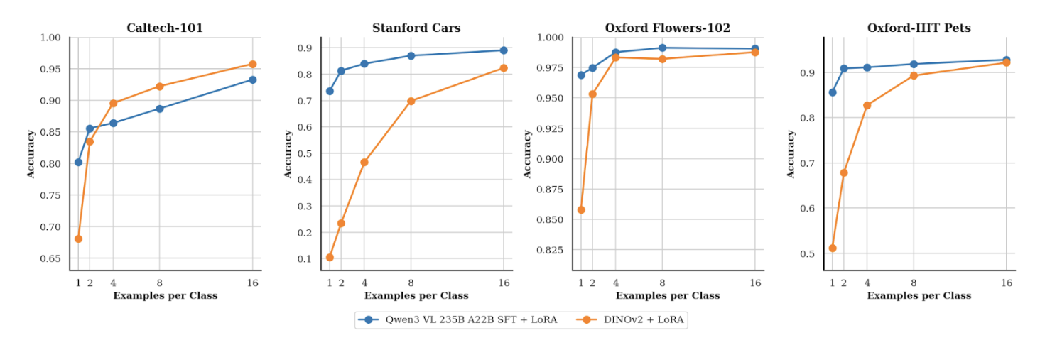 In the limited-data regime, Qwen3-VL-235-A22B outperforms DINOv2. Not only is it a bigger model, but as a VLM, it also comes with language knowledge out-of-the-box (i.e. what a “golden retriever” or “sunflower” is). This general language-and-vision capability of Qwen3-VL makes it readily available for vision tasks beyond classification.